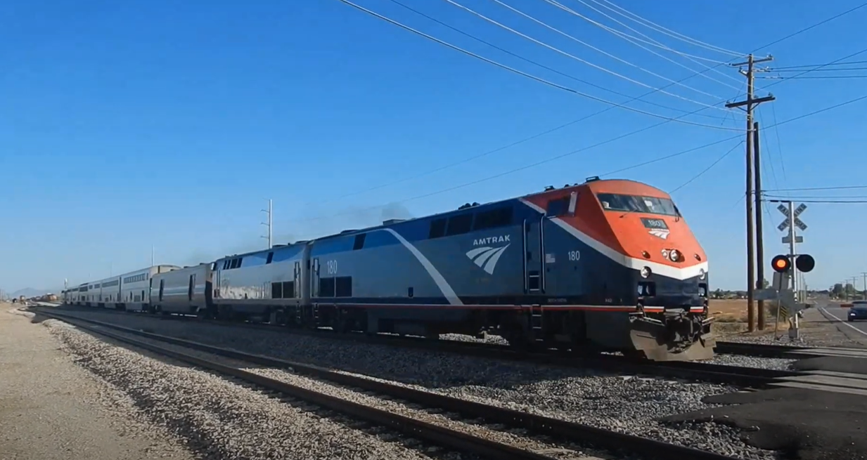 The Sunset Limited thunders through Casa Grande with a newly-repainted unit leading.