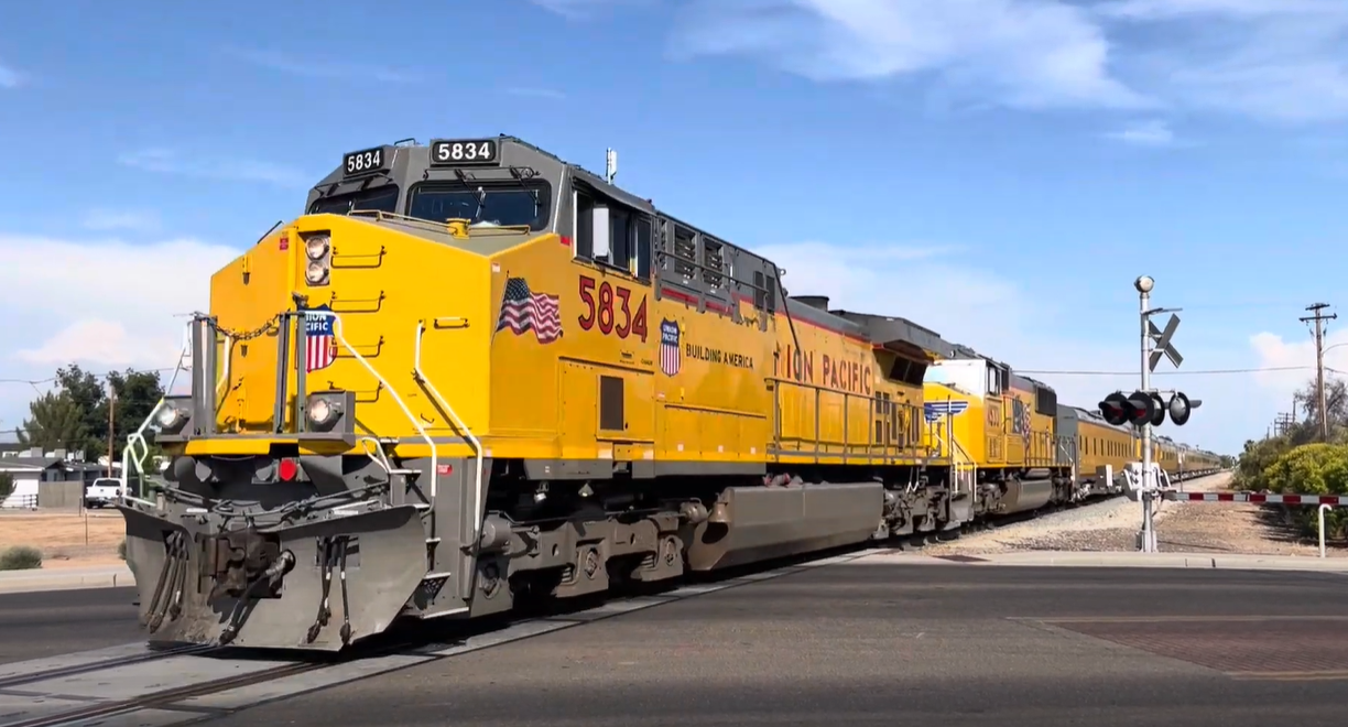 The inbound MHNPX Freight Train (Herrington, KS - Phoenix, AZ Mixed Freight) passes Elliot Rd Railroad Crossing with UP 1989 (the Rio Grande Heritage Unit) second out.