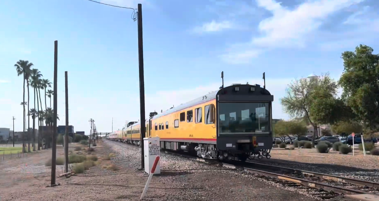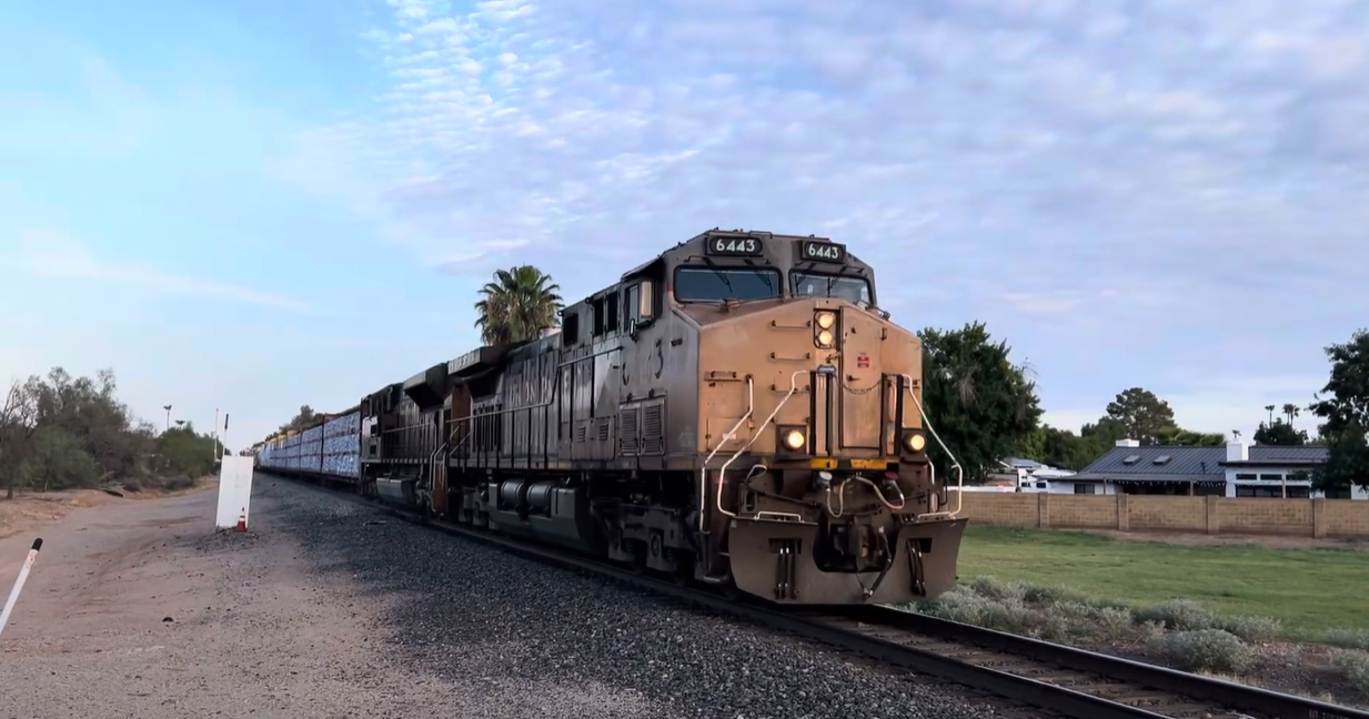 UP's OCS Train passes Downtown Gilbert, nowadays the only form of "passenger rail" in Phoenix.